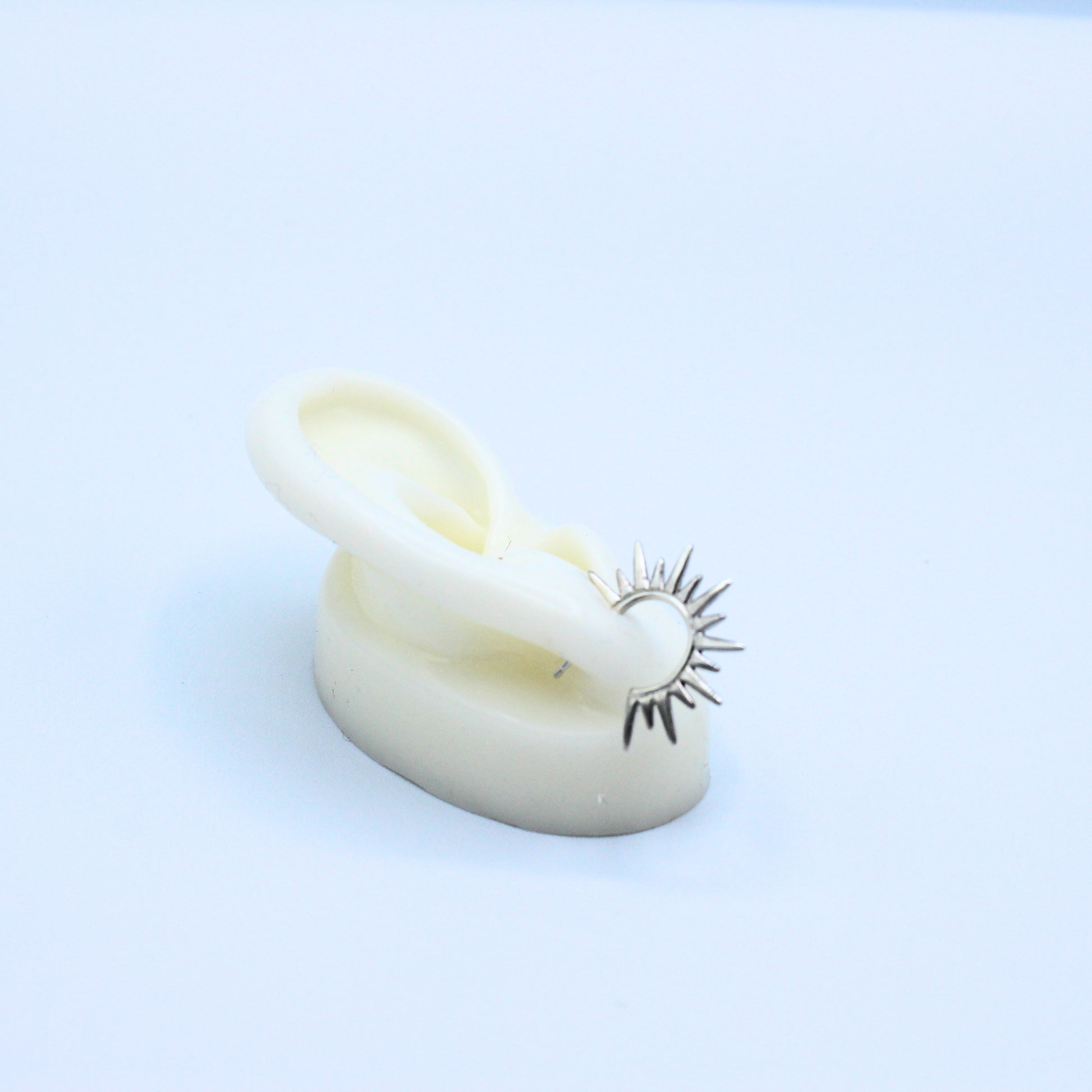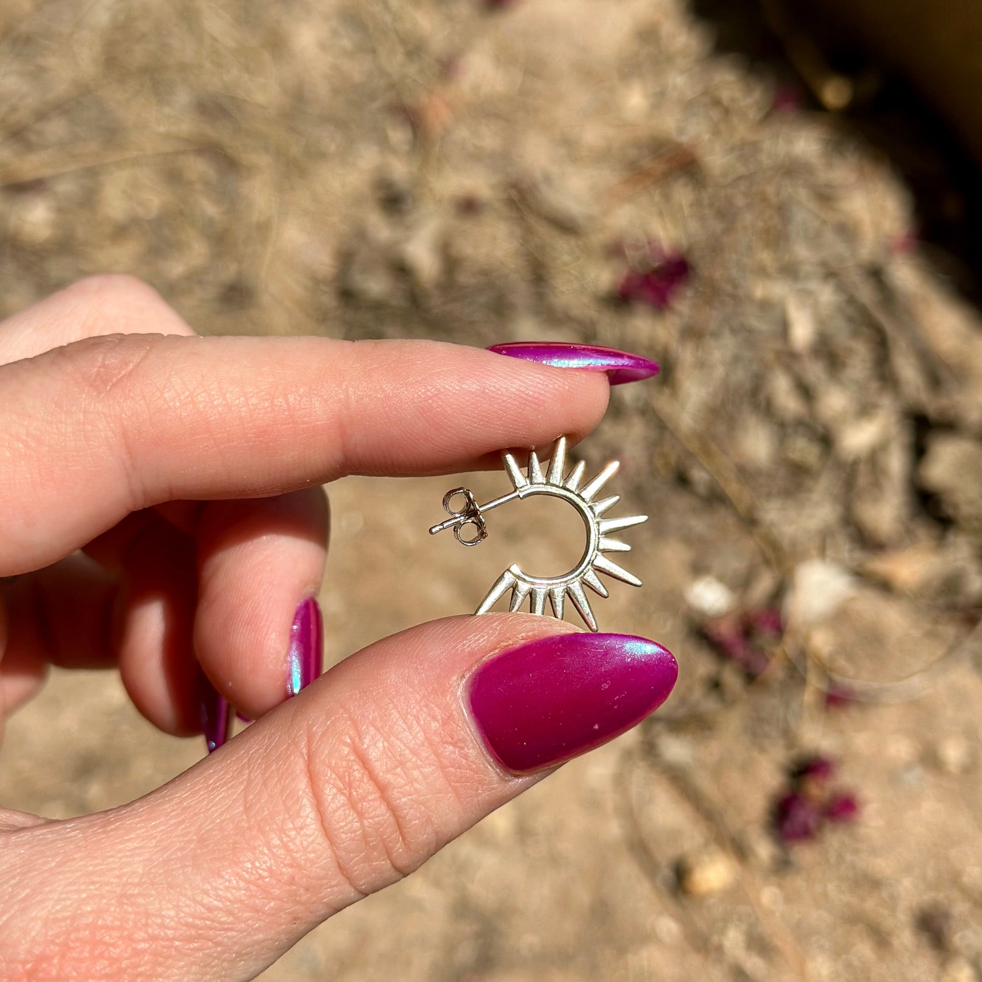 Radiant and bold, the Sol Hoops are inspired by the fierce energy of the sun. Handcrafted in solid sterling silver (.925), these unique sunburst hoop earrings feature striking rays that frame the face with celestial edge and effortless shine. Lightweight yet statement-worthy, they’re the perfect pair of silver hoops to carry you from everyday wear to special nights out.